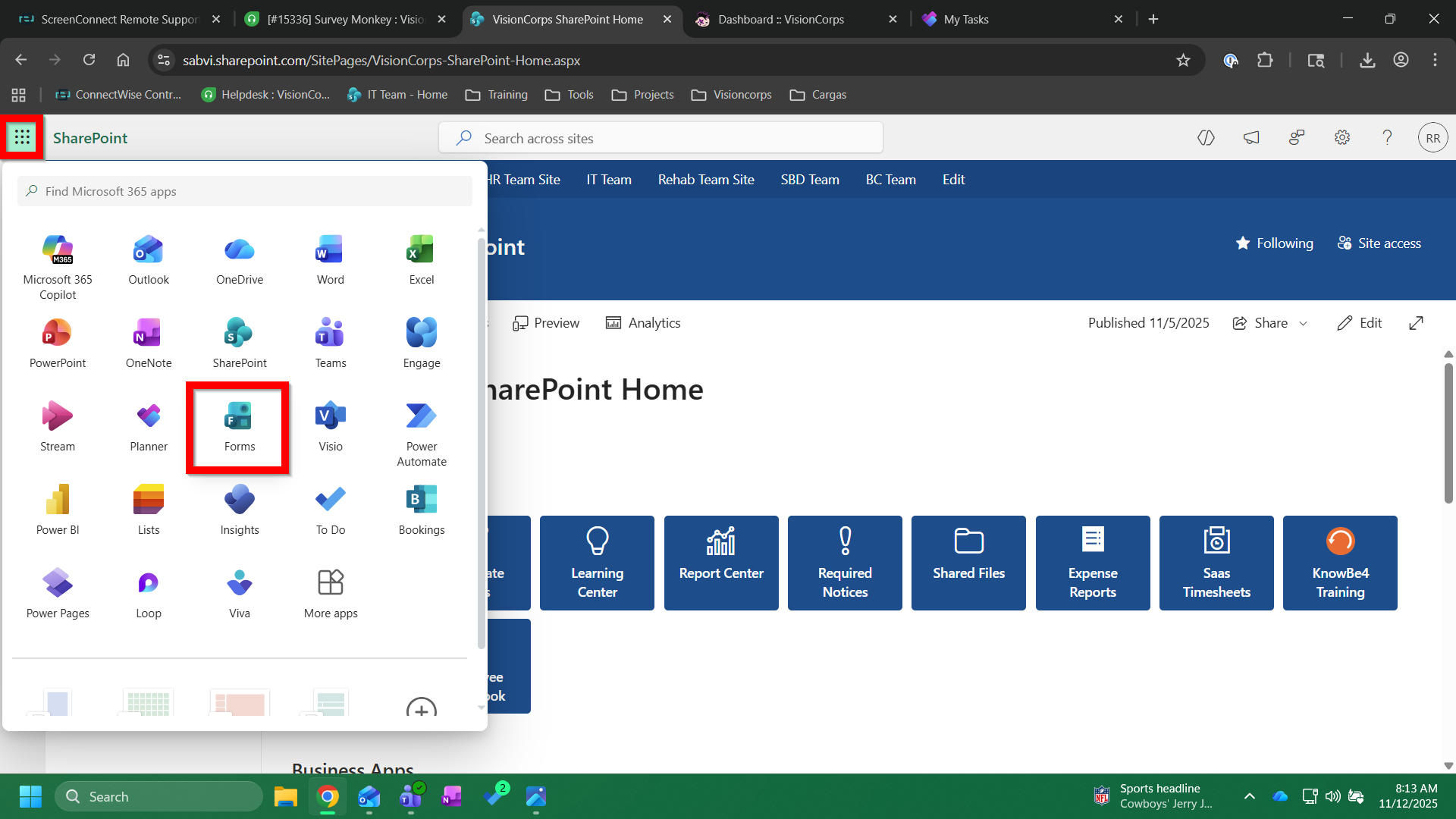 Microsoft Forms can be accessed through the App launcher (3x3 dots located on the top left corner) while you are on our SharePoint website or by navigating to forms.office.com.